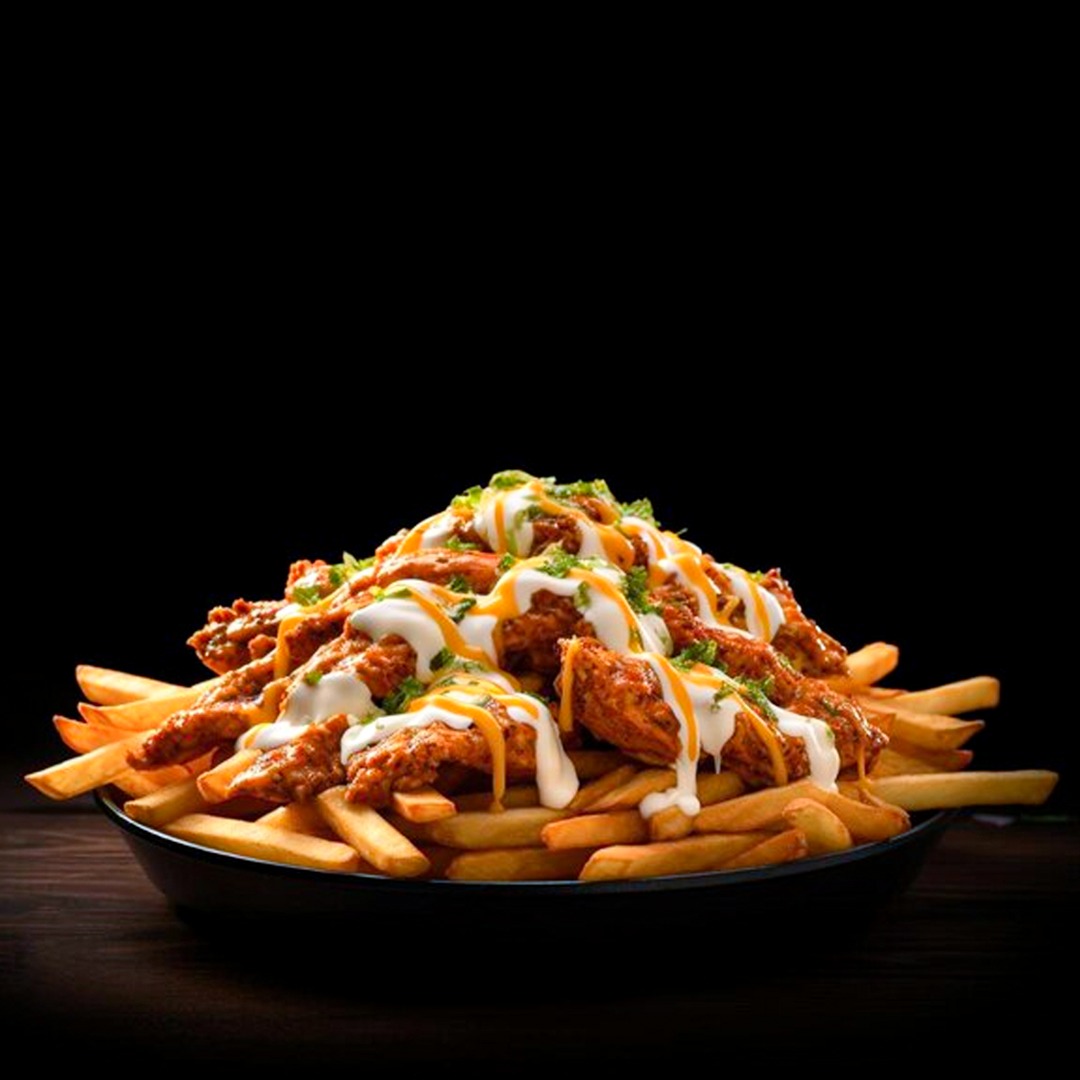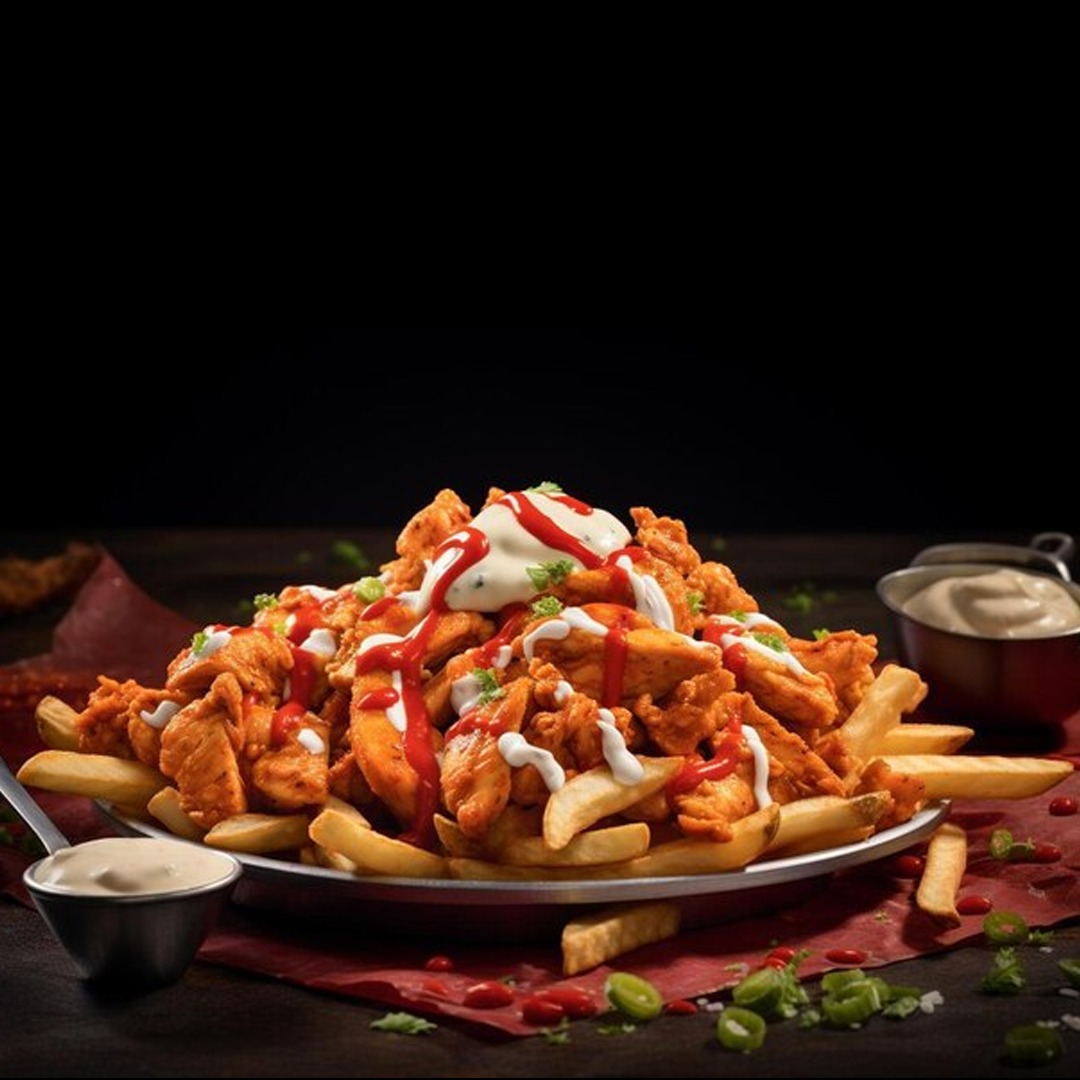 Spicy chicken, cheese sauce, jalapeno, spring onion